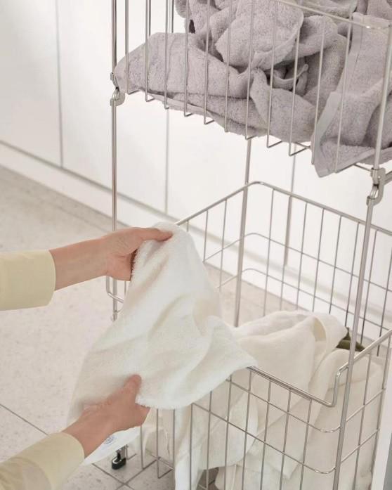 不锈钢脏衣篮,双层结构,适合多代家庭,做脏衣的分类存放,收纳容量充足,且配有万向轮方便移动。颜值也尚可,摆在家里提升家居颜值。