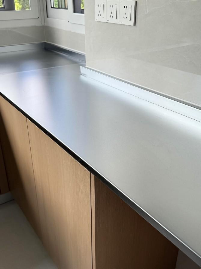 除了岩板台面,其他的柜子、台面均是用如下图中的“不锈钢板材”和实心不锈钢做的。高级感十足,且性能也给力,你几乎挑不出任何问题。唯一算是缺点的就是贵。